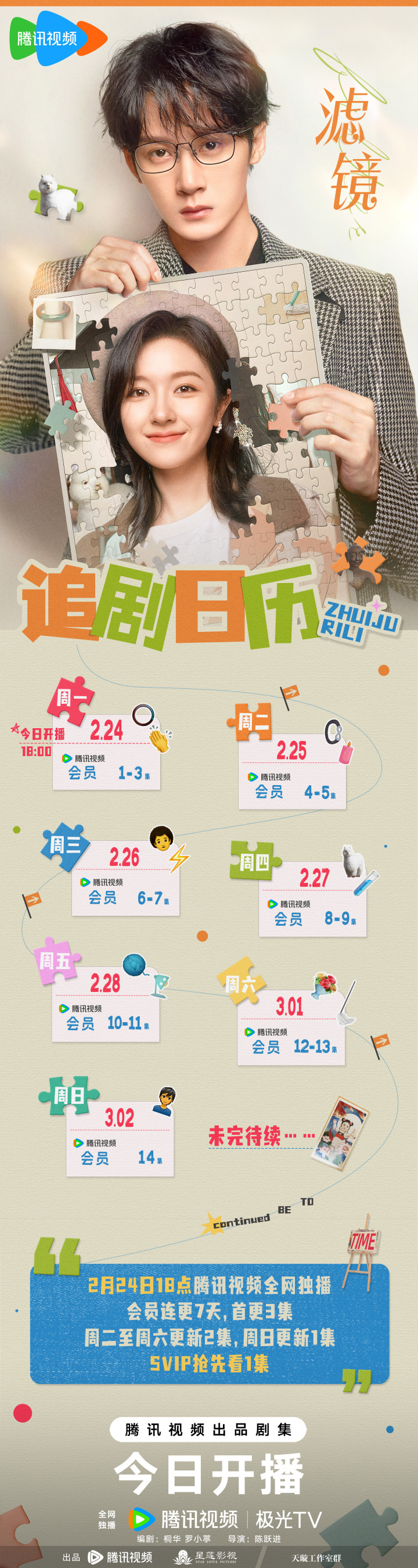 新京报讯2月24日,檀健次、李兰迪领衔主演的电视剧《滤镜》发布首周追剧日历。该剧于2月24日18点在腾讯视频独家开播,会员每天18点连更2集,首播3集,SVIP抢先看1集。